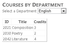 Run the page and use the drop-down list to select different departments. Only courses that are offered by the selected department are displayed in the GridView control.