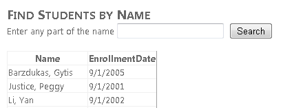 This markup is similar to what you've seen earlier except for the Where property value. The second part of the Where expression defines a substring search (LIKE %FirstMidName% or LIKE %LastName%) that searches both the first and last names for whatever is entered in the text box.