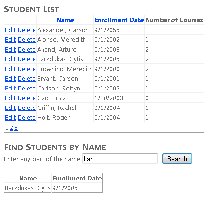 Open the Students.aspx page and in the StudentsGridView control replace the Name and Enrollment Date TemplateField elements with the following markup: