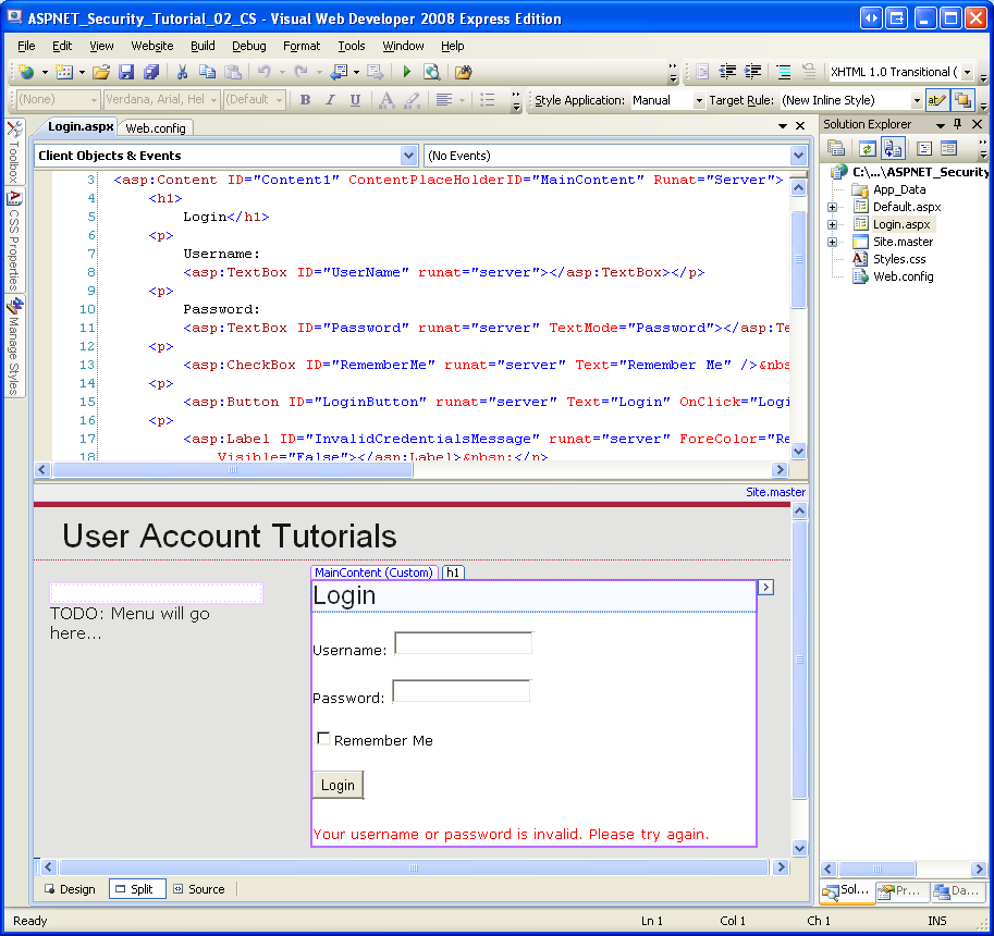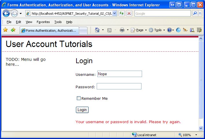 In this tutorial we will turn from mere discussion to implementation; in particular, we will look at implementing forms authentication. The web application we start constructing in this tutorial will continue to be built upon in subsequent tutorials, as we move from simple forms authentication to membership and roles.