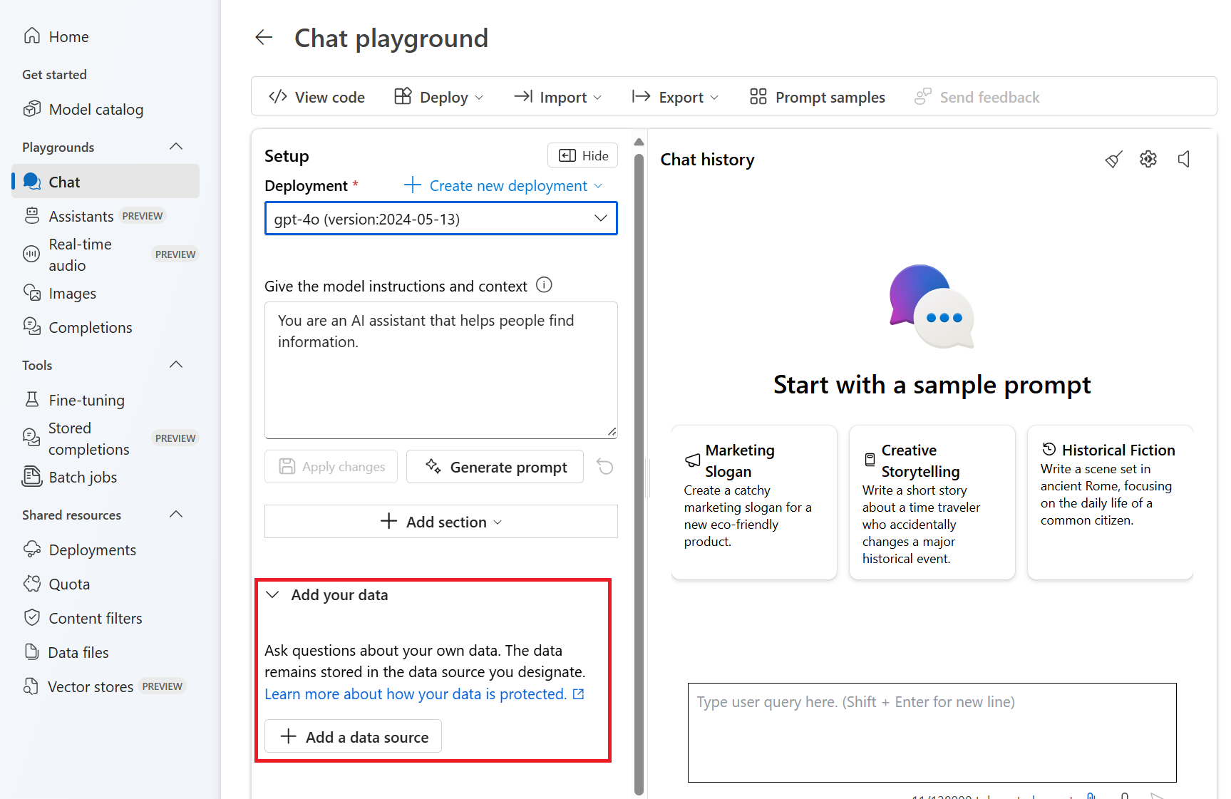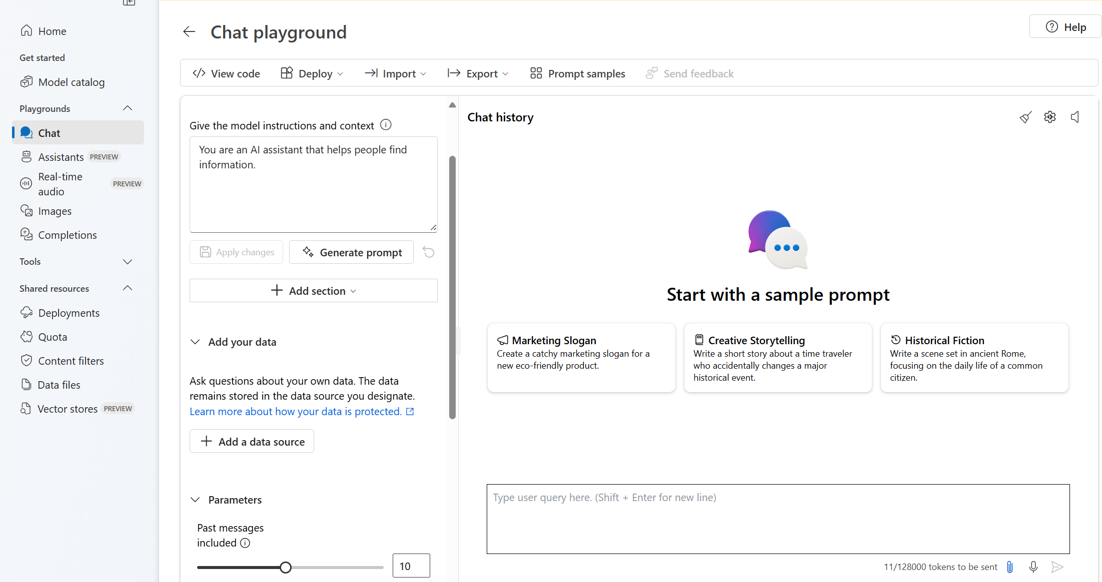 Start exploring Azure OpenAI capabilities with a no-code approach through the chat playground. It's simply a text box where you can submit a prompt to generate a completion. From this page, you can quickly iterate and experiment with the capabilities.