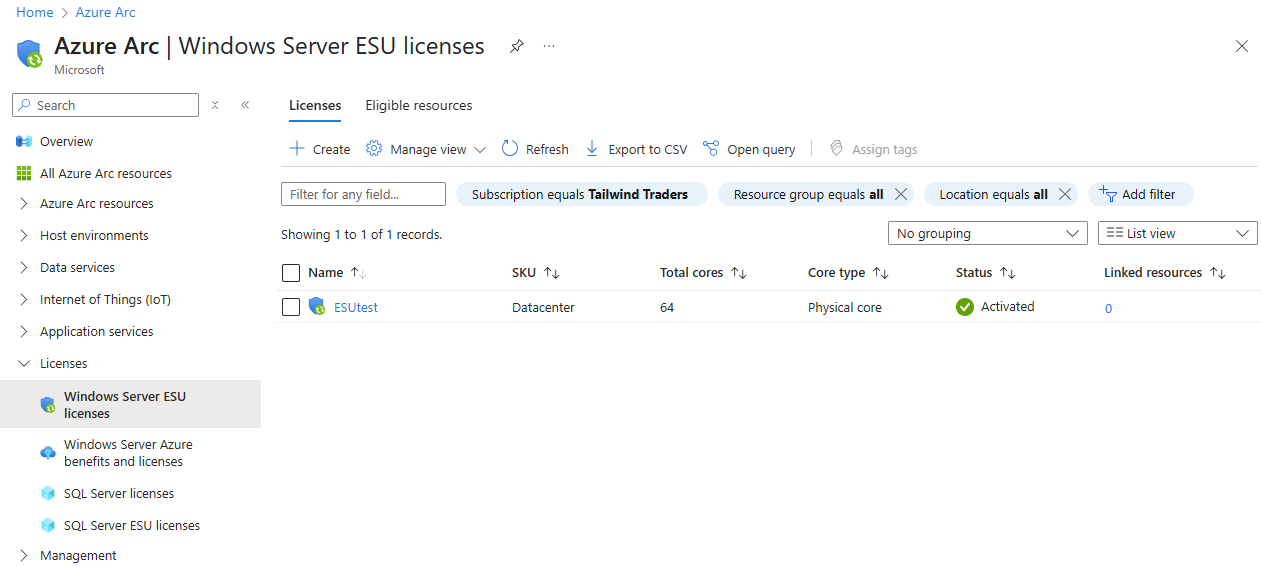 From here, you can view and create ESU Licenses and view Eligible resources for ESUs.