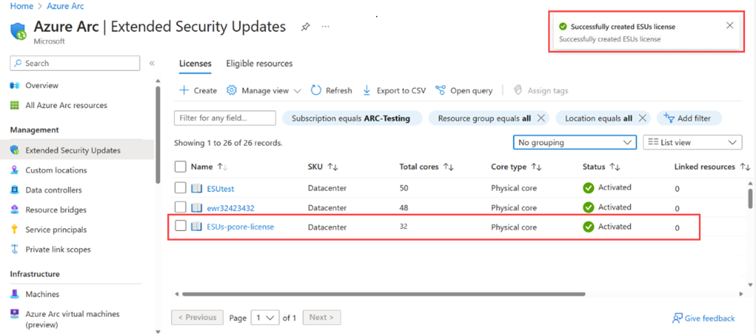 On the Azure Arc page, select Extended Security Updates in the left pane. From here, you can view and create ESU Licenses and view Eligible resources for ESUs.