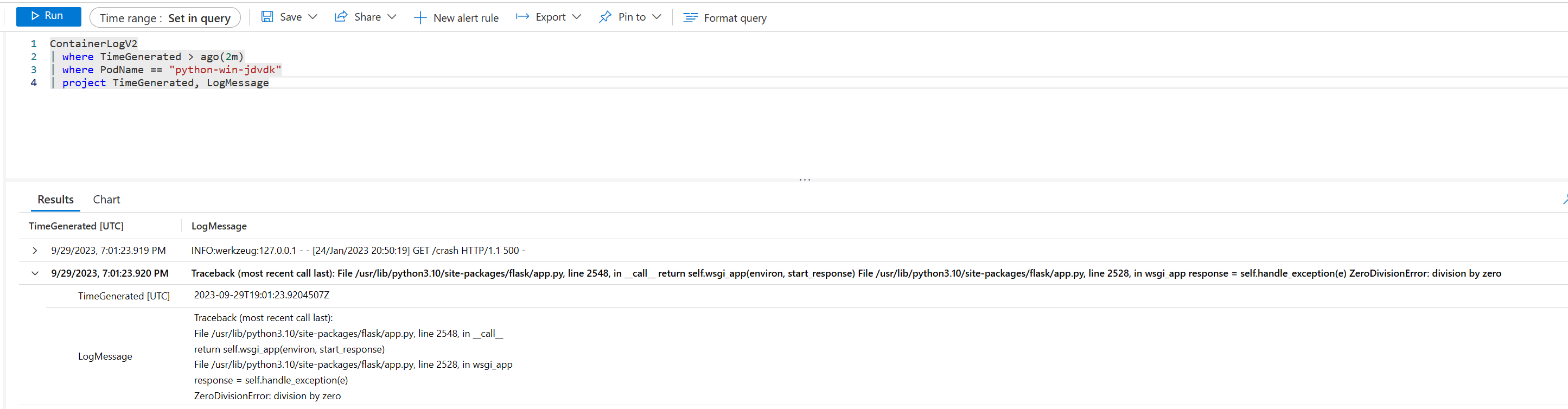 Schema Details at ContainerLog. Details at ContainerLogV2.
