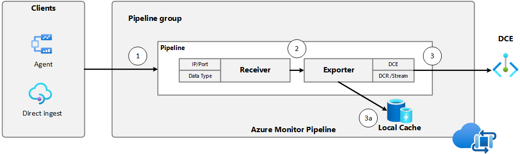 Detailed diagram of the steps and components for data collection using Azure Monitor pipeline.
