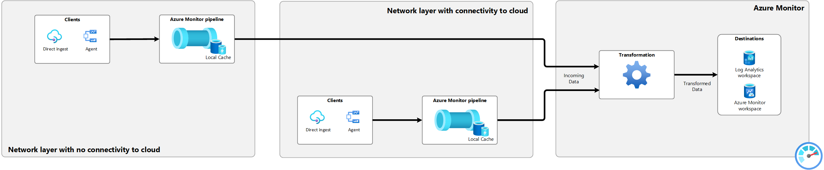 The Azure Monitor pipeline extends the data collection capabilities of Azure Monitor to edge and multicloud environments. It enables at-scale collection, and routing of telemetry data before it's sent to the cloud. The pipeline can cache data locally and sync with the cloud when connectivity is restored and route telemetry to Azure Monitor in cases where the network is segmented and data can't be sent directly to the cloud. This article describes how to enable and configure the Azure Monitor pipeline in your environment.