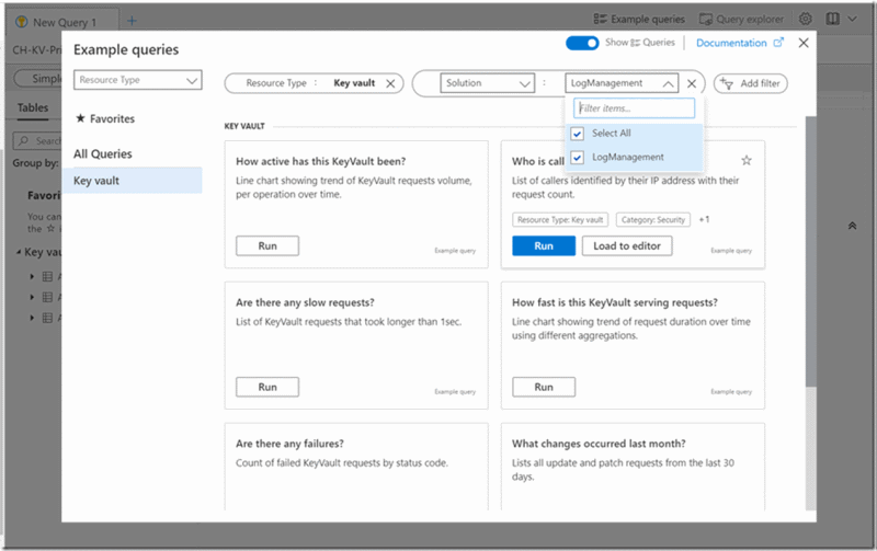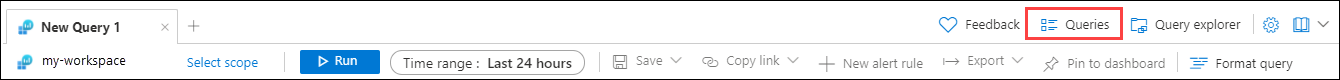 Resource group Example queries and queries from query packs for resource types in the resource.