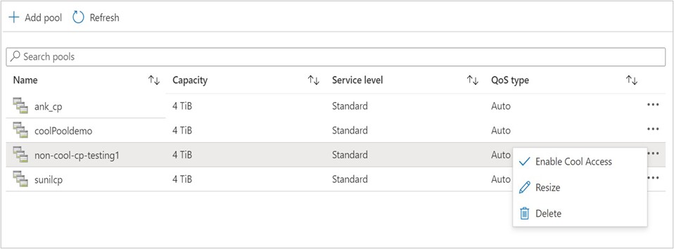 You can enable cool access support on an existing capacity pool. You can then add or modify volumes in the pool to use cool access.