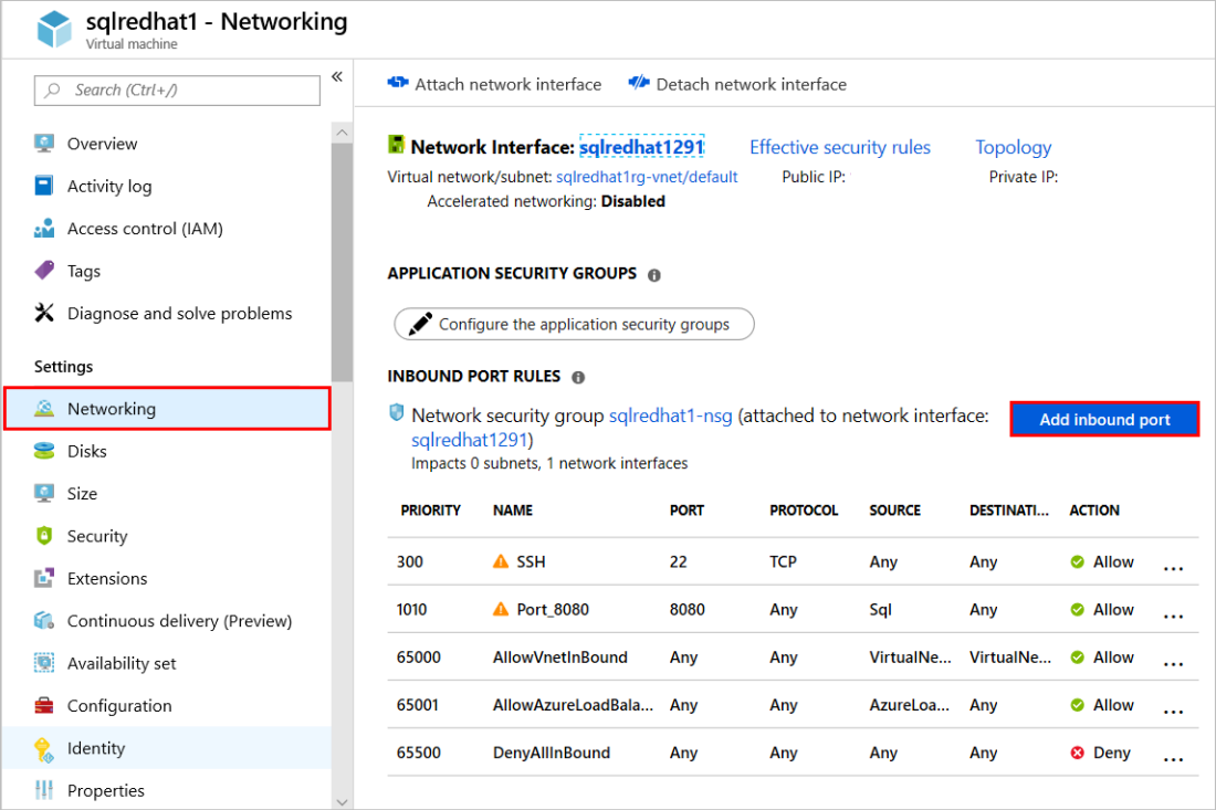 If you need to remotely connect to SQL Server on the Azure VM, you must configure an inbound rule on the network security group. The rule allows traffic on the port on which SQL Server listens (default of 1433). The following steps show how to use the Azure portal for this step.