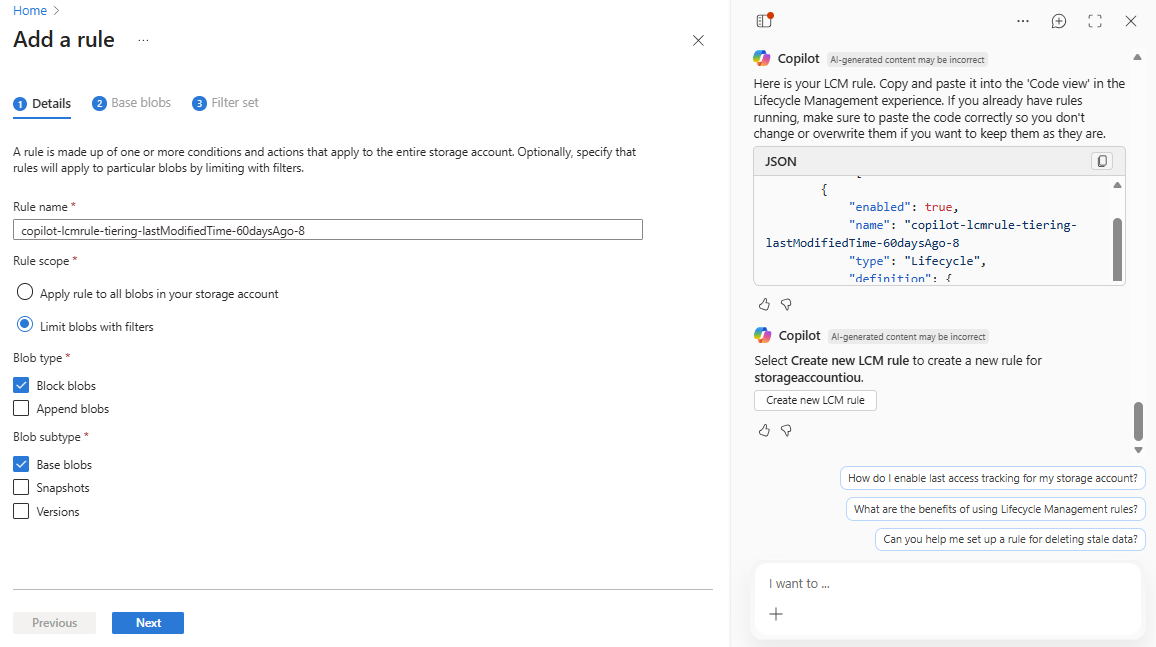 When you ask Azure Copilot about reducing your storage costs, it provides suggestions and helps you accomplish bulk tiering by automating lifecycle management policy authoring.
