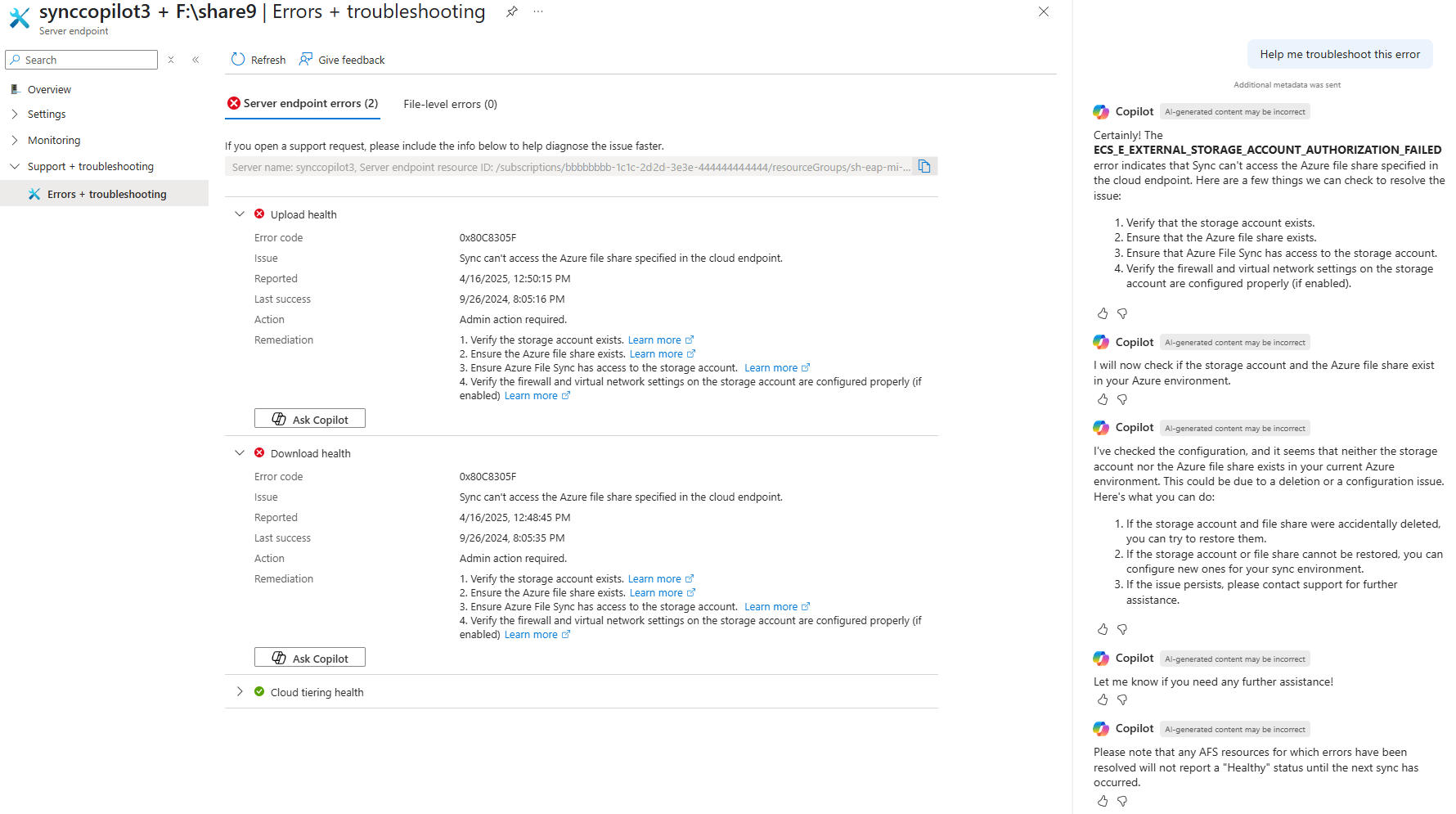 If you use Azure File Sync, Azure Copilot can help you quickly troubleshoot and resolve common issues. It analyzes your environment to identify potential root causes, such as network issues, incorrect permissions, or missing file shares. After that, Azure Copilot provides actionable recommendations.