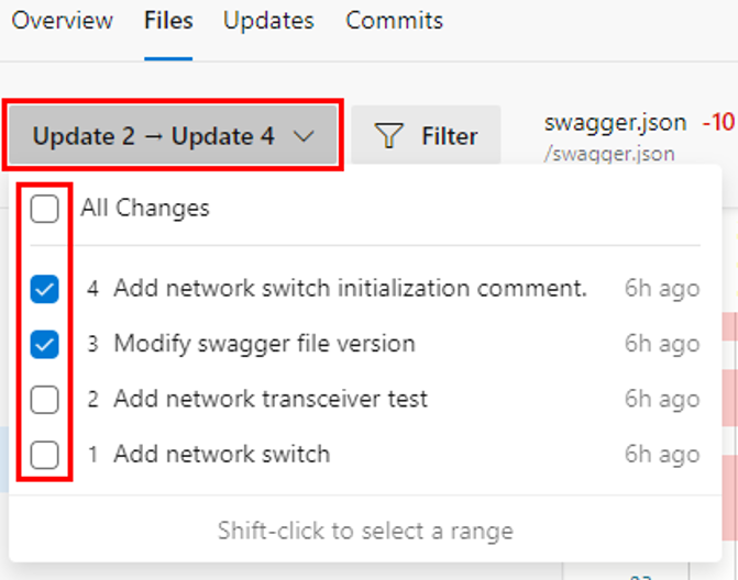 5. To review the changeset introduced by specific pushes to the source branch, select one or more changesets from the changes dropdown list. When you select one or more changesets, the diff view updates to show only the changes from the selected changesets. This feature is useful when changes have been pushed to the PR since your last review and you just want to see the new changes. The changes dropdown list names each changeset with the commit message from the final commit in each push operation.
