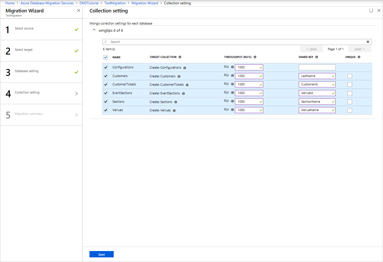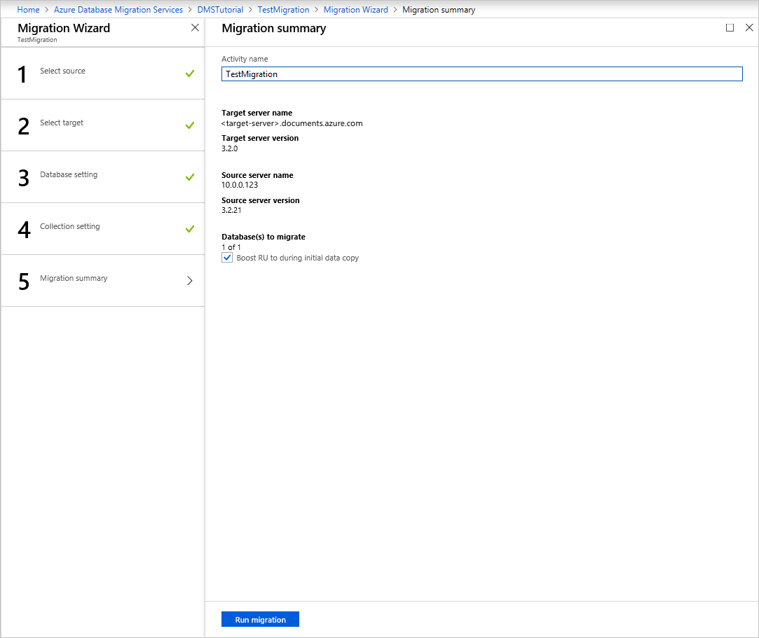 You can specify the number of RUs that you want the collections to use. Azure Database Migration Service suggests smart defaults based on the collection size.