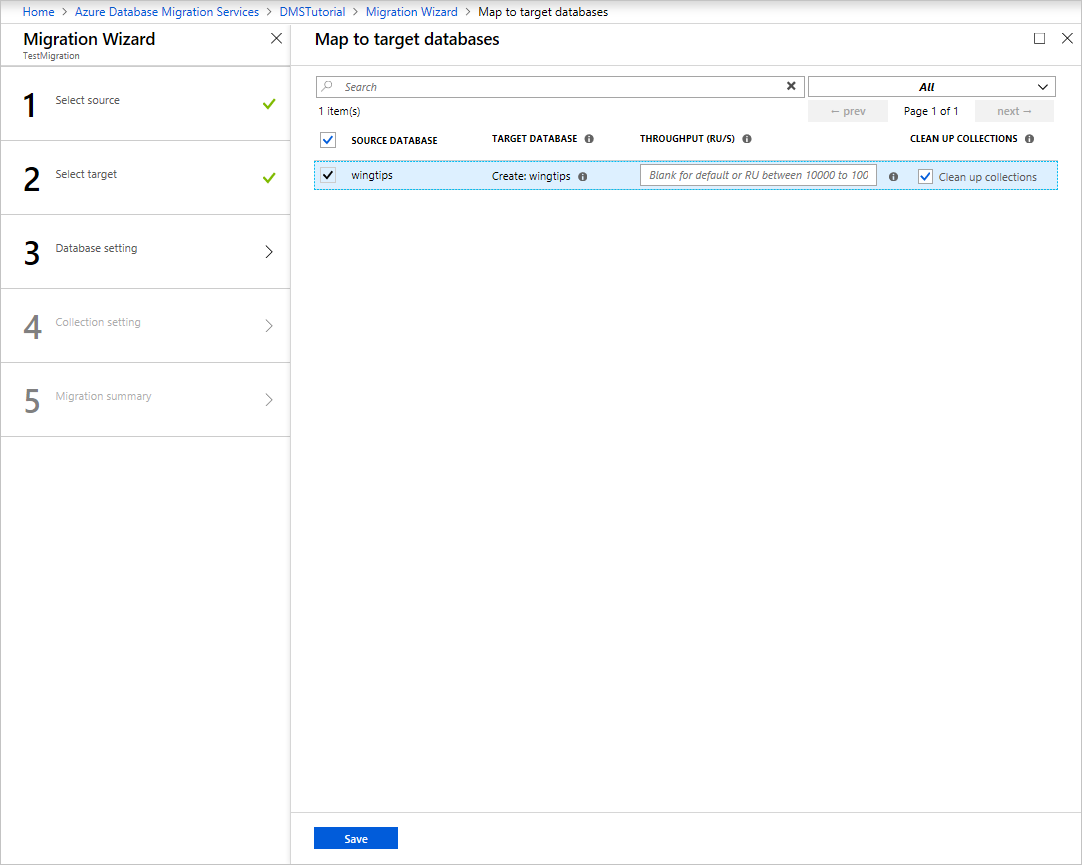 At this point in the migration, you can provision throughput. In Azure Cosmos DB, you can provision throughput either at the database level or individually for each collection. Throughput is measured in request units. Learn more about Azure Cosmos DB pricing.