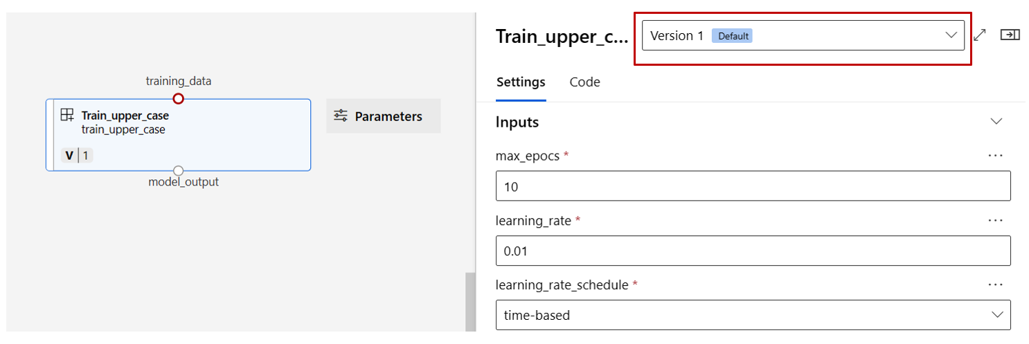 Find the train, score, and eval components registered in previous section then drag-and-drop them on the canvas. By default it uses the default version of the component. To change to a specific version, double click on the component to open the component pane.