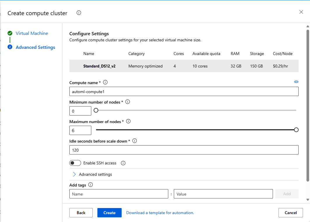 Virtual machine size Select the virtual machine size for your compute. A list of recommended sizes is provided based on your data and experiment type. Standard_DS12_V2