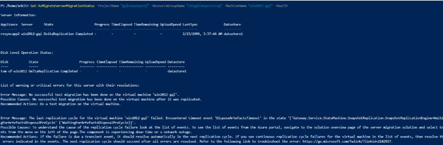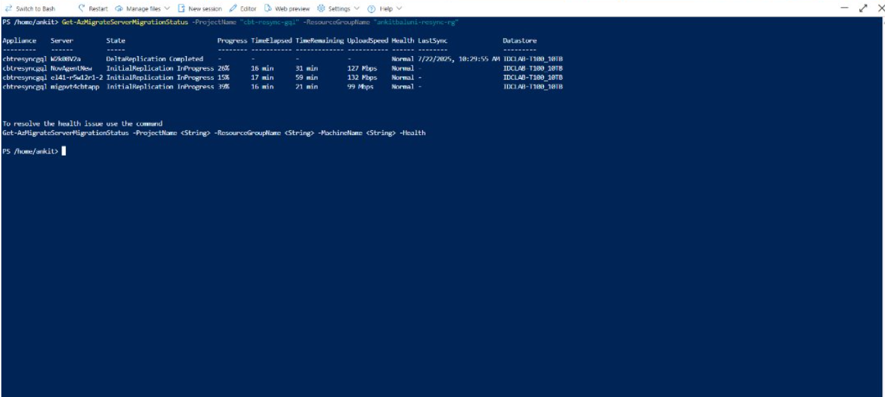Get-AzMigrateServerMigrationStatus -ProjectName "<your-project-name>" -ResourceGroupName "<your-resource-group>" -MachineName "<your-server-name>" -Health