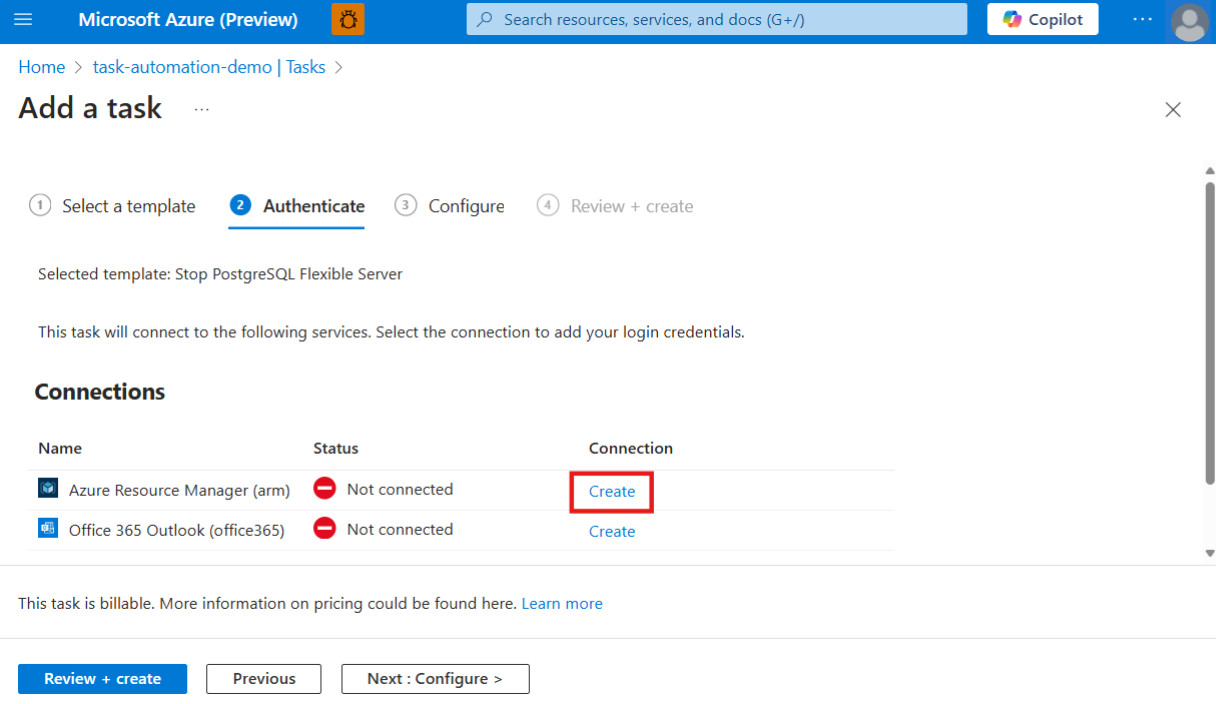Under Configure, provide a name for the task and any other information required. When you're done, select Review + create.