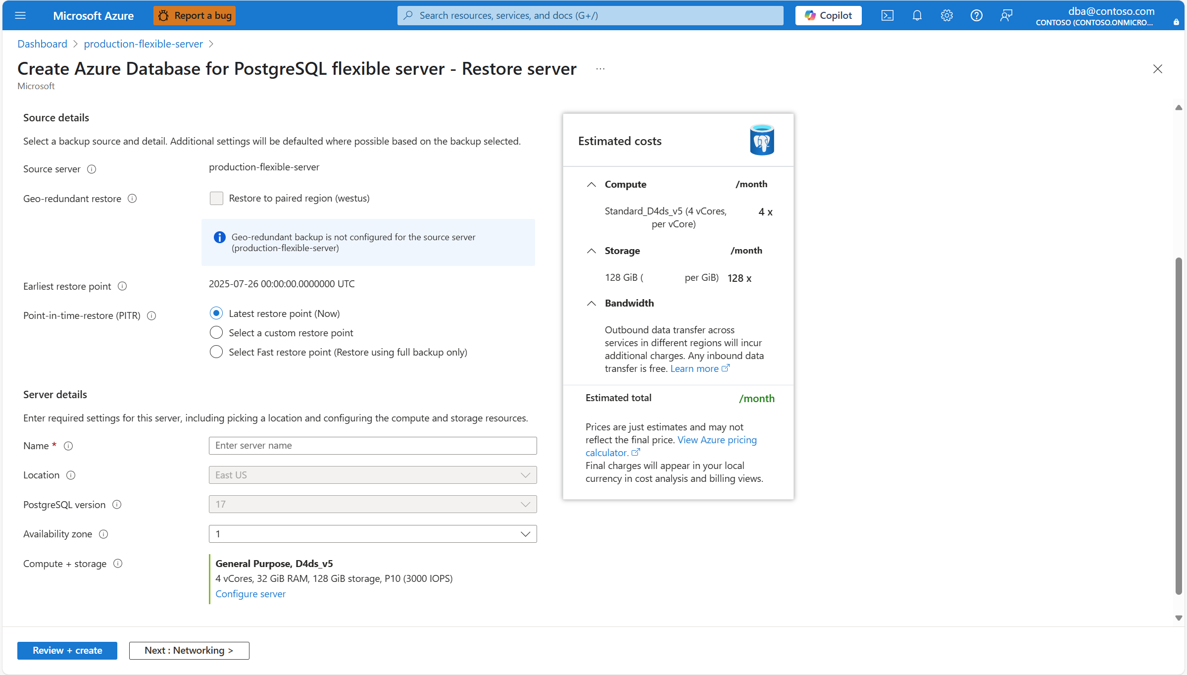 Geo-redundant restore If the source server was created with geo-redundant backups, this option would be enabled. If it's enabled, you could restore a backup kept in the storage account of the paired region to create a new server in that other region.