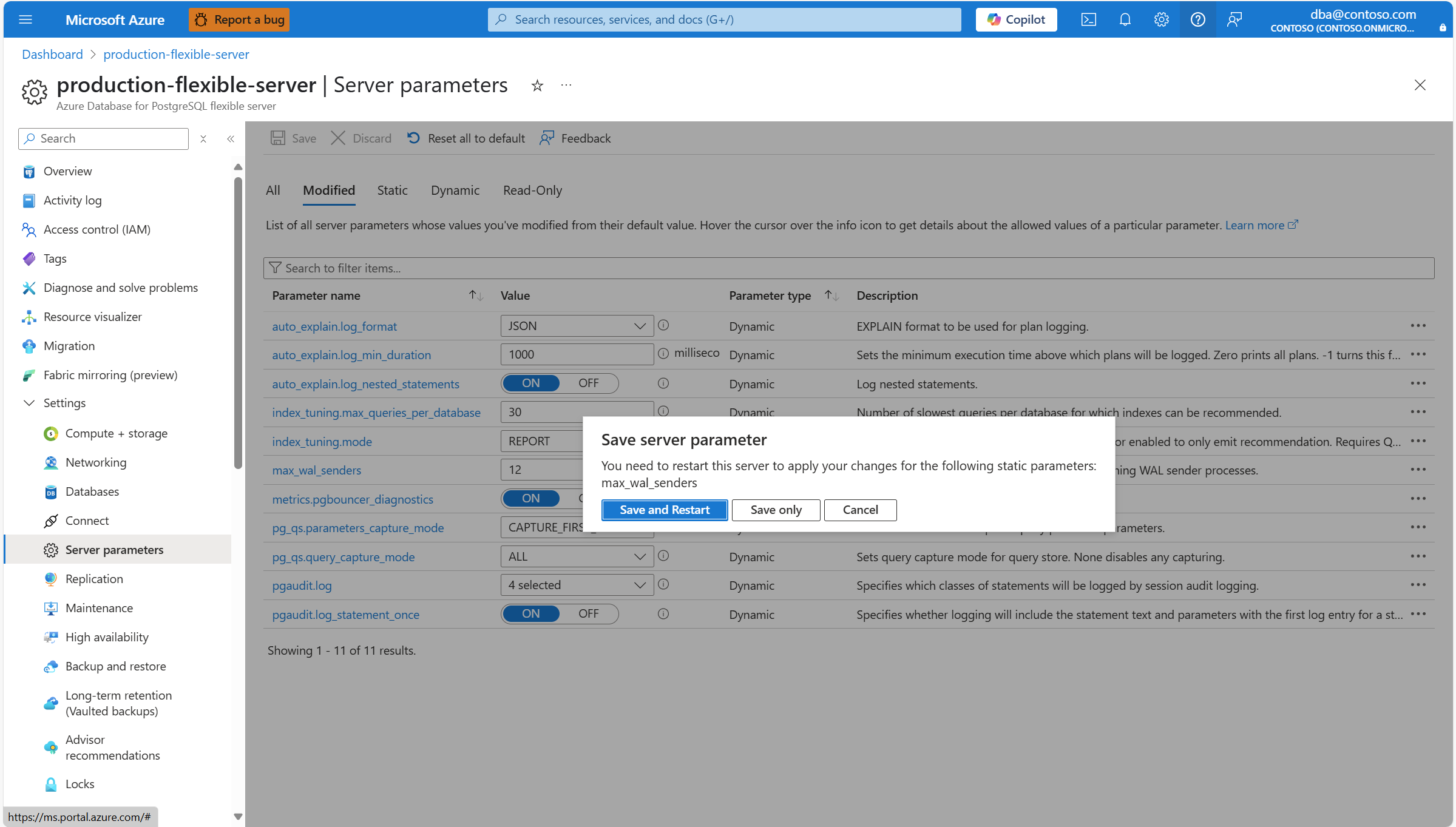 6. If, for any of the parameters whose current value doesn't match their default, the column Parameter type is equal to Static, the server requires a restart for the change to take effect. In that case, a dialog pops up so that you can select if you want to: