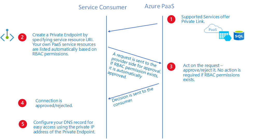 Microsoft.<Provider>/<resource_type>/privateEndpointConnectionsApproval/actionManually request: Use this method when you don't have the required permissions and want to request access. An approval workflow is initiated. The private endpoint and later private-endpoint connections are created in a Pending state. The private-link resource owner is responsible to approve the connection. After it's approved, the private endpoint is enabled to send traffic normally, as shown in the following approval workflow diagram: