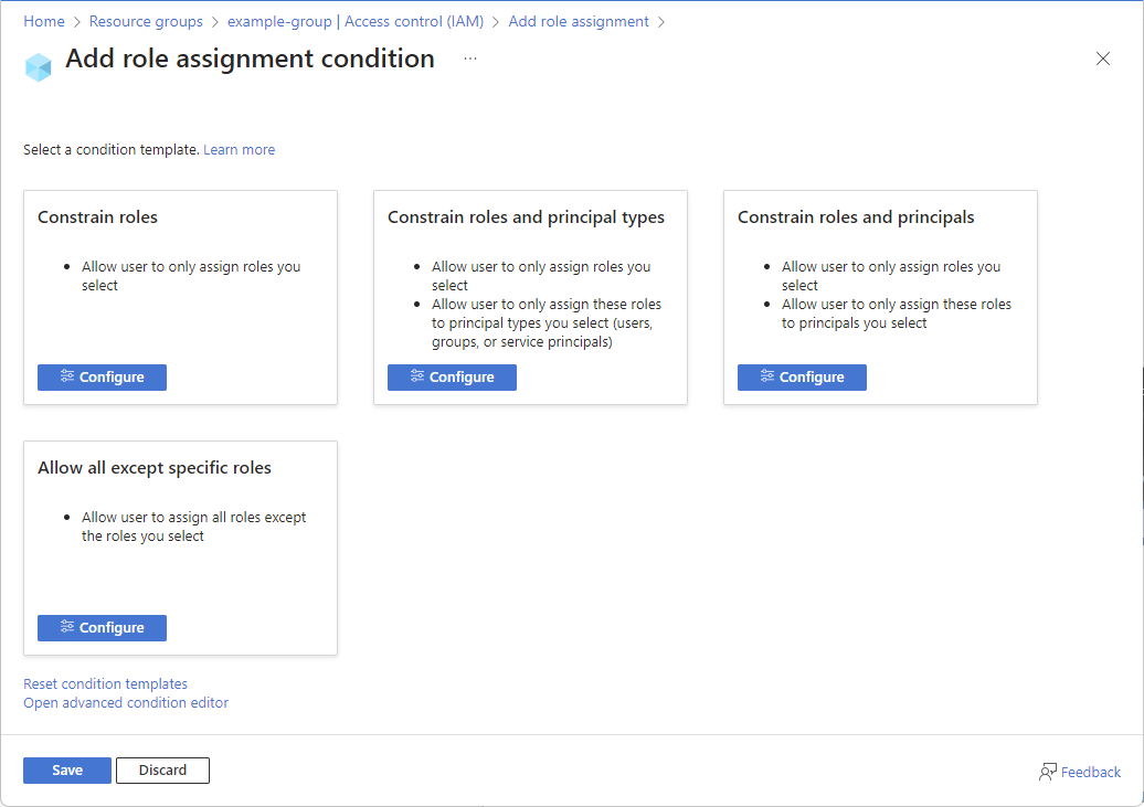 Allow user to only assign these roles to principal types you select (users, groups, or service principals)Constrain roles and principals Allow user to only assign roles you select