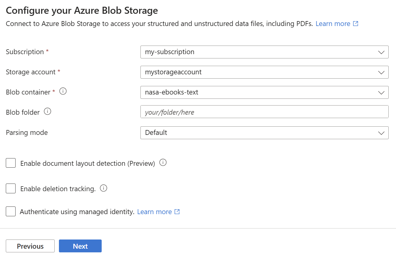 Upload sample data files to a container on Azure Storage. We used some small text files from NASA's earth book to test these instructions on a free search service.
