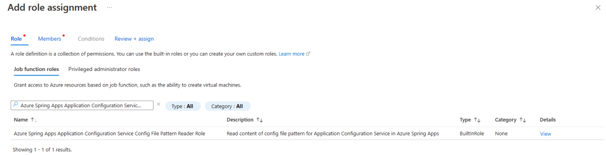First, you must have the Azure role Azure Spring Apps Application Configuration Service Config File Pattern Reader Role assigned to you.