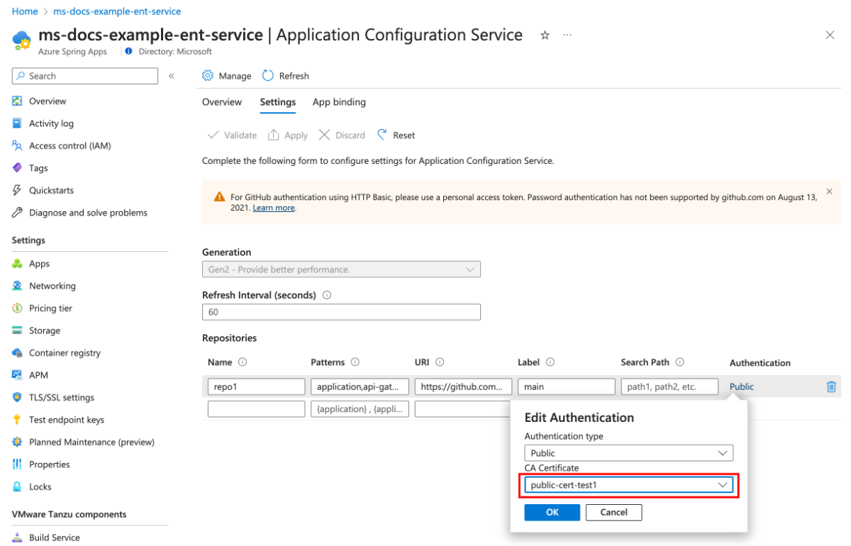 The following screenshot shows the three types of repository authentication supported by Application Configuration Service:
