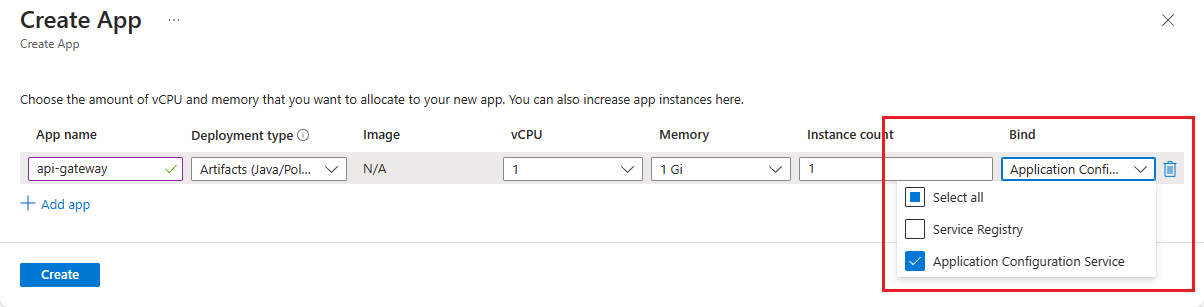 Select Create to finish creating your app and binding it to the Application Configuration Service.