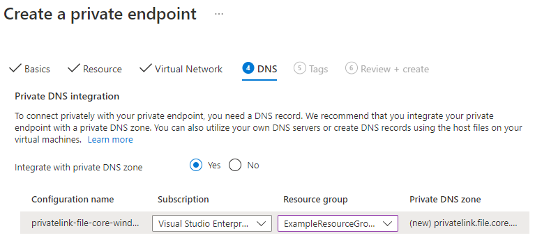 Select Yes for Integrate with private DNS zone. Make sure the correct subscription and resource group are selected, and then select Next: Tags.