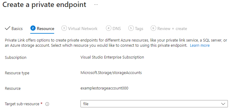 Confirm that the Subscription, Resource type and Resource are correct, and select File from the Target sub-resource drop-down. Then select Next: Virtual Network.