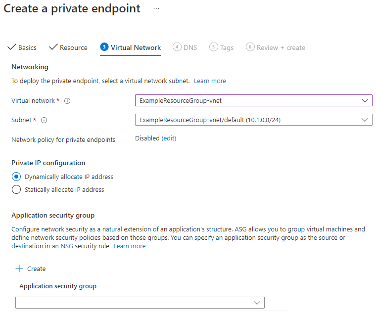 Under Networking, select the virtual network associated with your VM and leave the default subnet. Under Private IP configuration, leave Dynamically allocate IP address selected. Select Next: DNS.
