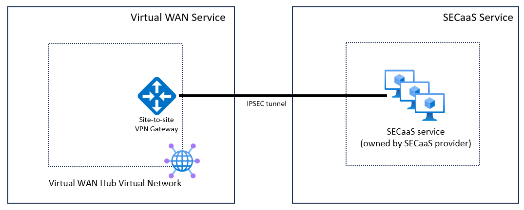 Azure Firewall Manager's security partner integrations simplify the process of connecting Virtual WAN to a third-party security-as-a-service (SECaaS) offering, ensuring protected Internet access for users. Unlike SaaS solutions, SECaaS infrastructure isn't deployed directly into the Virtual WAN hub but is still hosted by the SECaaS provider. Deploying a SECaaS solution through Azure Firewall Manager automatically establishes a Site-to-site VPN tunnel between the third-party security infrastructure and the Virtual WAN hub's Site-to-site VPN Gateway.
