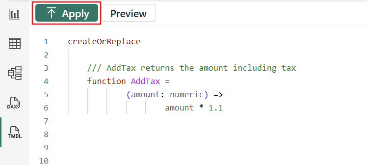 You can define and/or update user-defined functions in TMDL view. For additional information on TMDL view, see TMDL view.