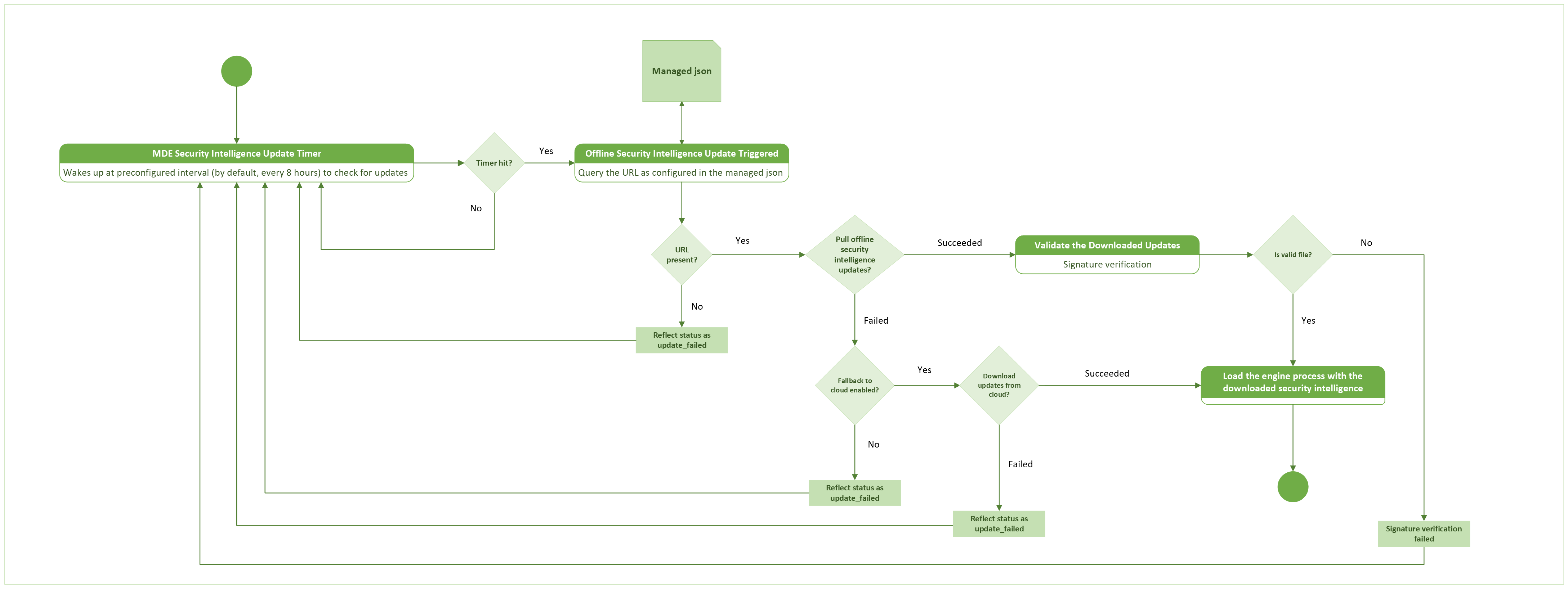 offlineDefinitionUpdateFallbackToCloud true/false Determine the Defender for Endpoint security intelligence update approach when "offline mirror server" fails to serve the update request. If set to true, the update is retried via the Microsoft cloud when "offline security intelligence update" failed; else, vice versa.