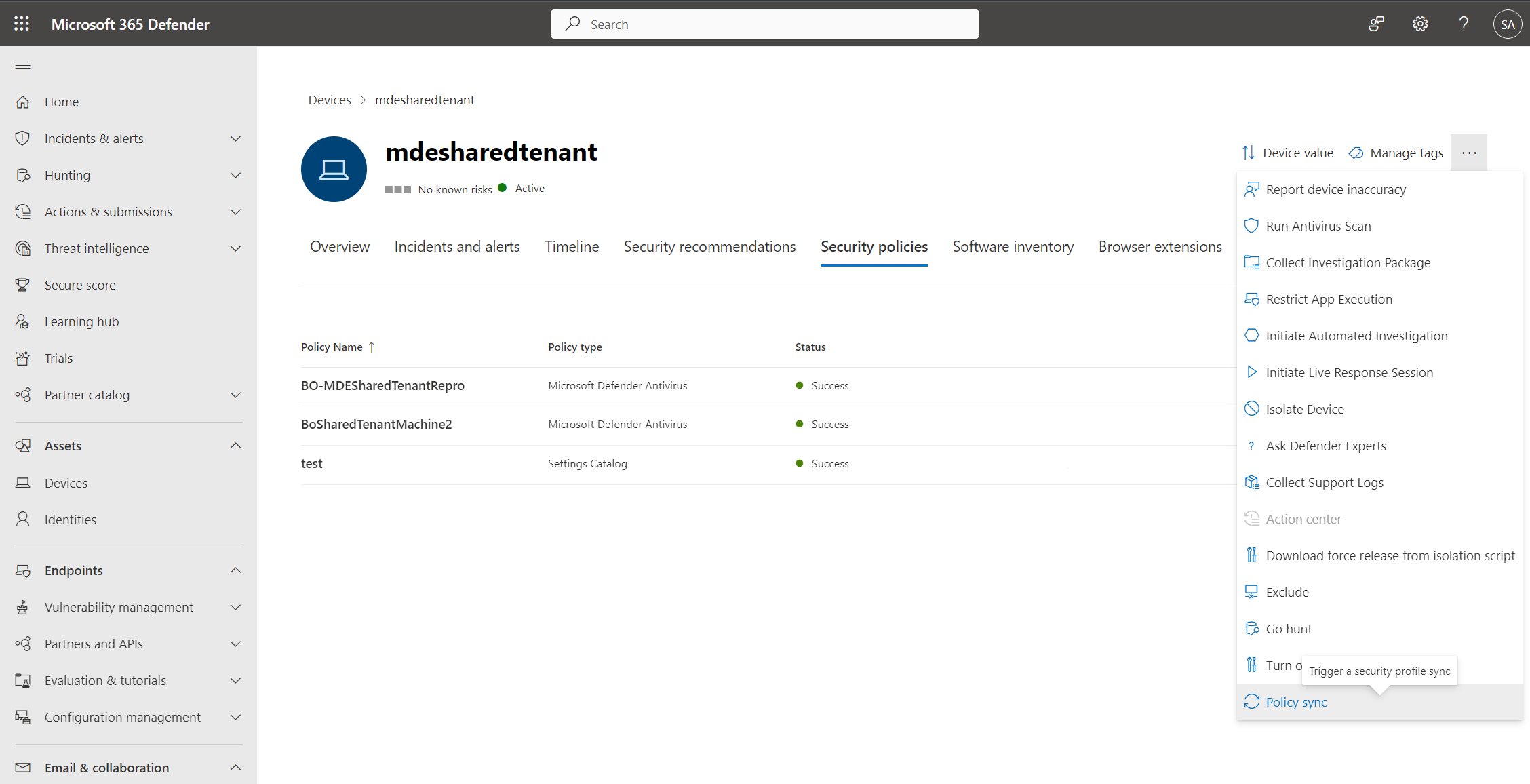 During an investigation, you can also view the Security policies tab in the device page to view the list of policies that are being applied to a particular device. For more information, see Investigating devices.