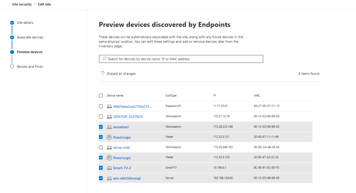 In this stage, you review all of the devices discovered by the system. This gives admins the opportunity to review and remove devices before confirming the site creation. A list of all devices to be associated with this site is displayed.