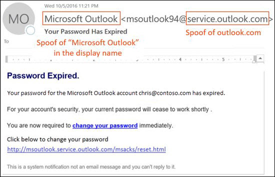 msoutlook94@service.outlook.com:This message didn't come from service.outlook.com, but the attacker spoofed the From header field to make it look like it did. The sender attempted to trick the recipient into selecting the change your password link and providing their credentials.
