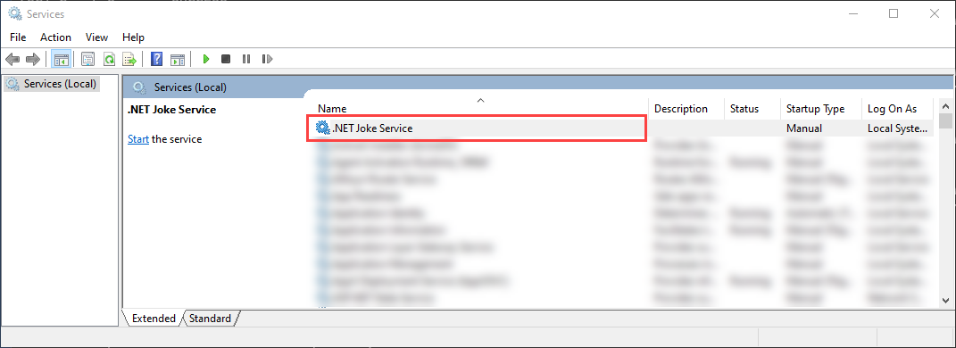 To see the app created as a Windows Service, open Services. Select the Windows key (or Ctrl + Esc), and search from "Services". From the Services app, you should be able to find your service by its name.