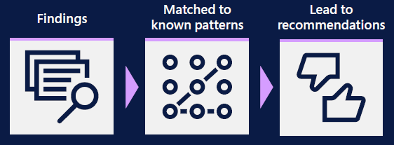 Three boxes with arrows to illustrate that findings are matched to known patterns that then lead to recommendations.