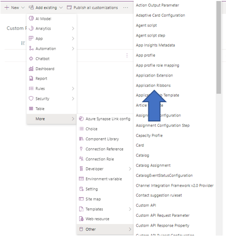 When modifying a ribbon, we recommend that you back up the out-of-the-box ribbon. For example, create a new solution, Custom Ribbon, and then choose the Add existing menu, and then choose Application Ribbons to add your native Application Ribbon.