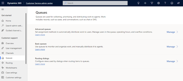 You manage advanced queues and routing in the Customer Service admin center.
