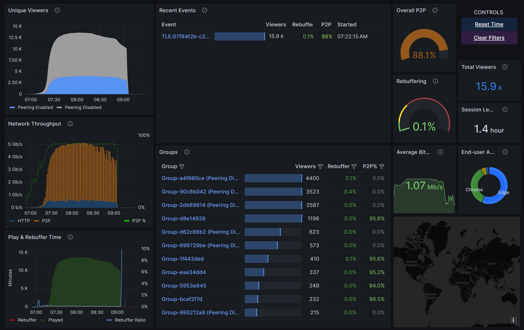 Rebuffering - Global rebuffering % for the selected time range, calculated as total-time-rebuffered/(total-time-rebuffered + total-time-played). The lower % the better.