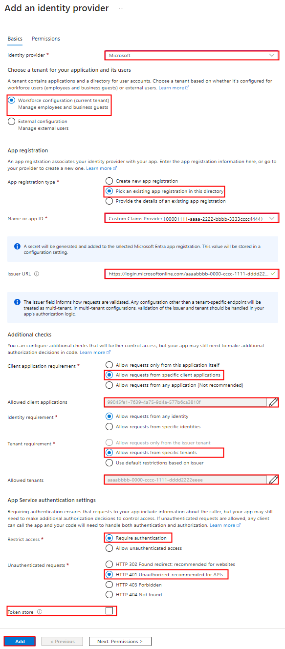 If you configured the Microsoft identity provider, skip this step. Otherwise, if the Azure Function is hosted under a different tenant than the tenant in which your custom authentication extension is registered, follow these steps to protect your function: