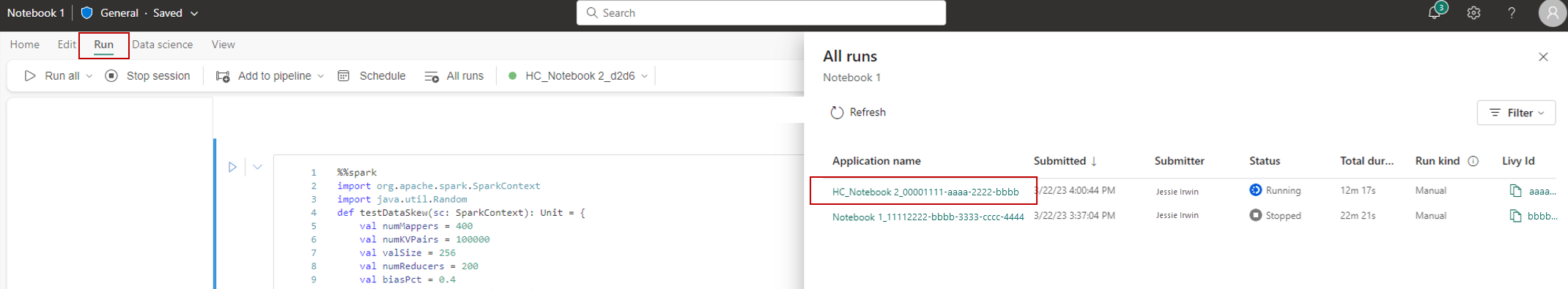 In the case of high concurrency session, users could identify the jobs and its associated logs from different notebooks using the Related notebook tab, which shows the notebook from which that job has been run.