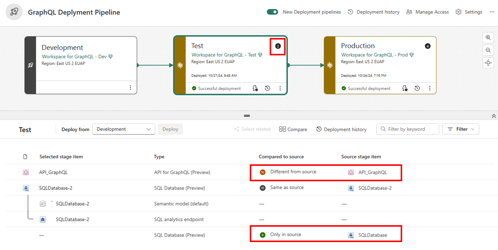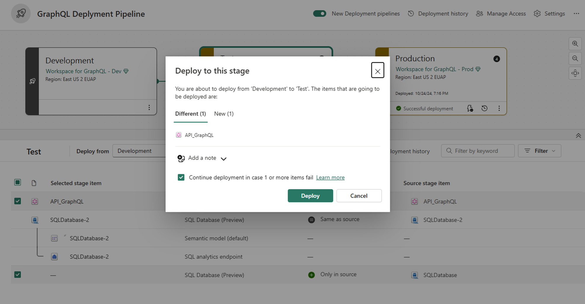 1. Select the items that need to be deployed. Select Deploy to deploy your selected items (API for GraphQL and its Connected Data source) across the Development, Test, and Production stages.