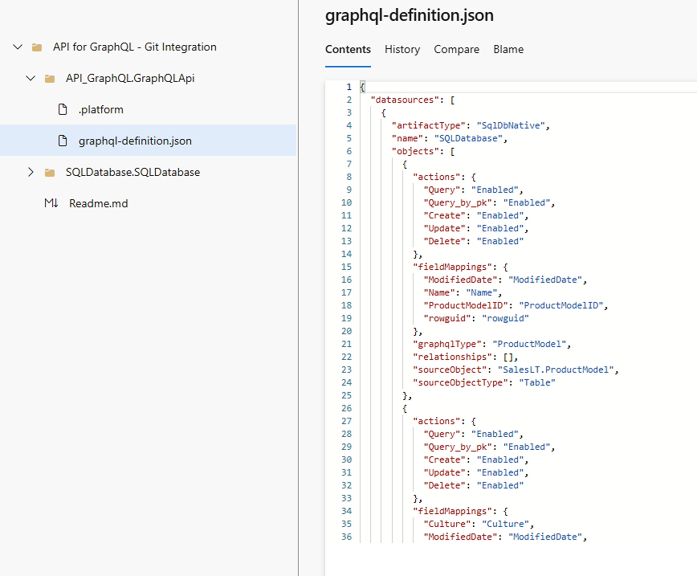 When you commit the API for GraphQL item to the Git repo, the API for GraphQL definition is stored. This approach supports a precise recovery when you sync back to a Fabric workspace: