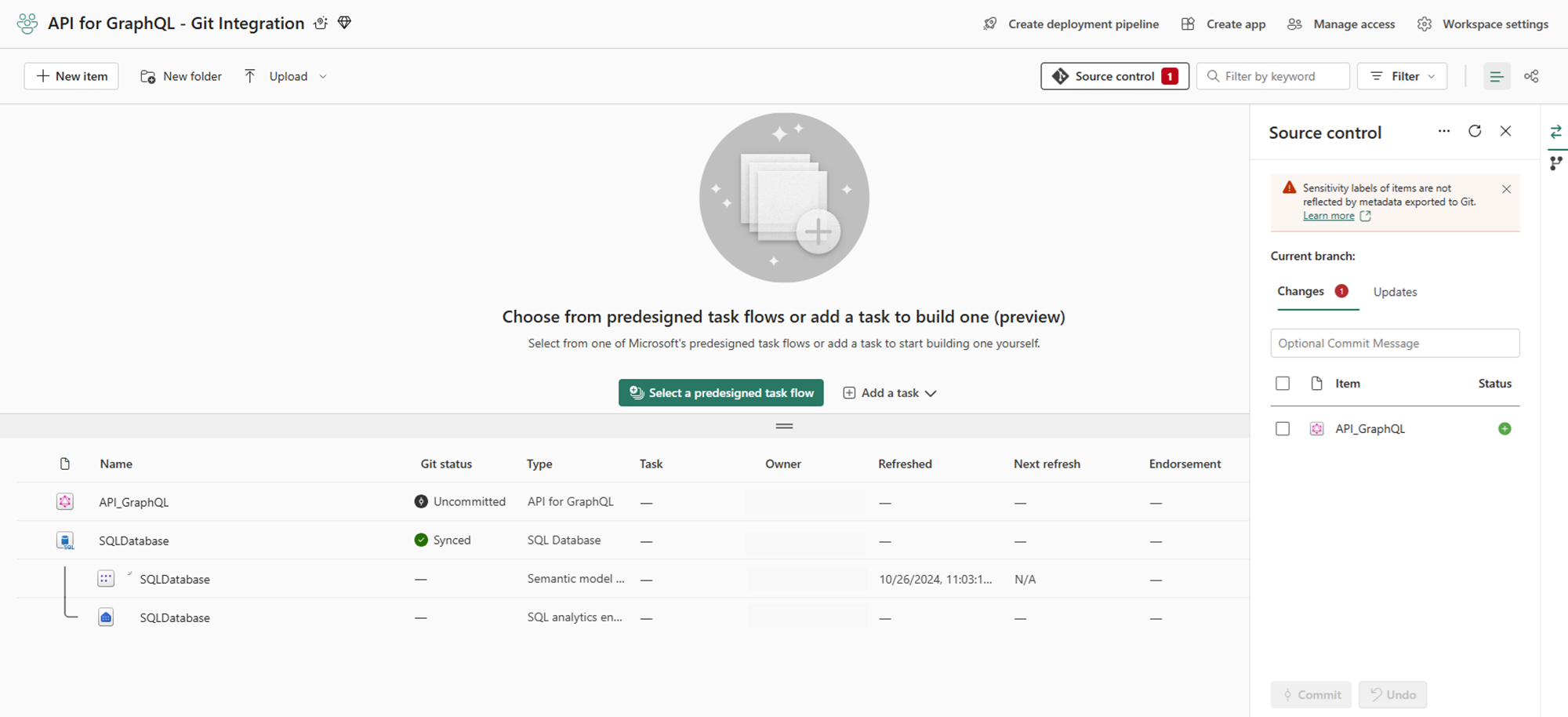 From your Workspace settings, you can easily set up a connection to your repo to commit and sync changes. To set up the connection see Get started with Git integration. Once connected, your items, including API for GraphQL, appear in the Source control panel.
