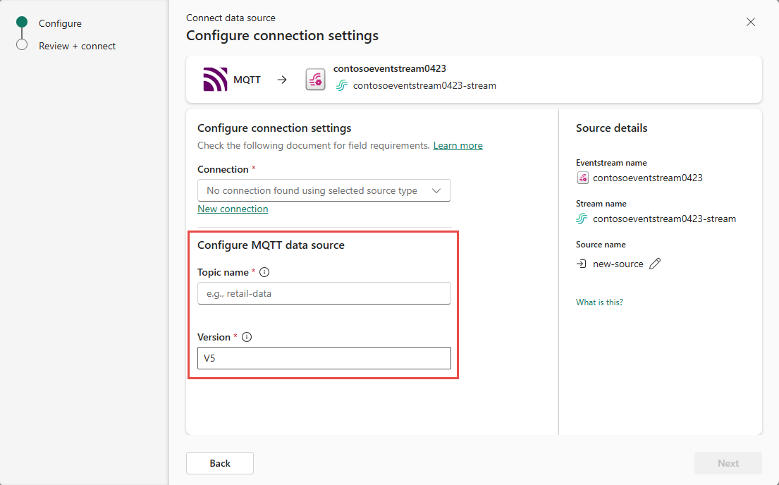 - On the Review + connect page, if you select Open eventstream, the wizard opens the eventstream that it created for you with the selected MQTT source. To close the wizard, select Close at the bottom of the page.